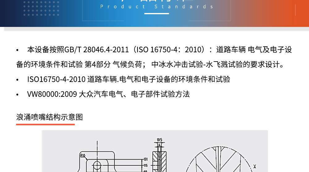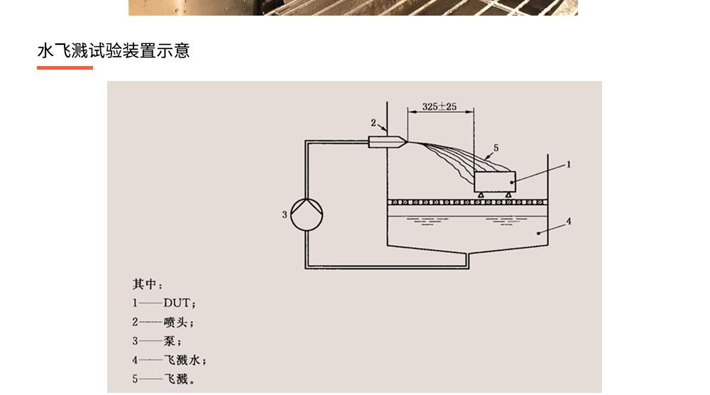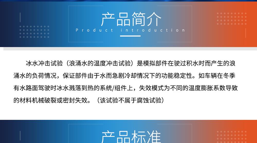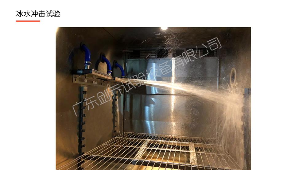 用途:冰水沖擊試驗(浪涌水的溫度沖擊試驗)是模擬部件在駛過積水時而產(chǎn)生的浪涌水的負荷情況,保證部件由于水而急劇冷卻情況下的功能穩(wěn)定性。如車輛在冬季有水路面駕駛時冰水濺落到熱的系統(tǒng)/組件上,失效模式為不同的溫度膨脹系數(shù)導致的材料機械破裂或密封失效