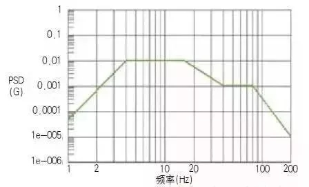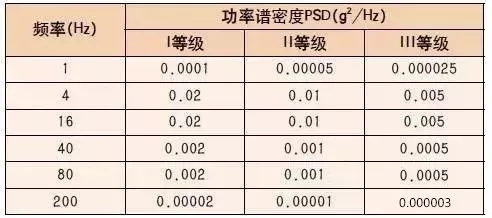 隨機(jī)振動(dòng)試驗(yàn)具體測試方法《GB/T 4857.23-2012》中有介紹,這里只介紹三個(gè)力學(xué)條件量值功率譜密度 (PSD)、加速度均方根 (Grms) 和振動(dòng)時(shí)間。國內(nèi)外通過采集運(yùn)輸數(shù)據(jù),利用統(tǒng)計(jì)學(xué)制定出隨機(jī)振動(dòng)譜。以ASTM D4169-08為例,如圖: