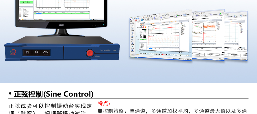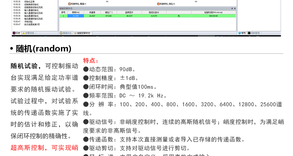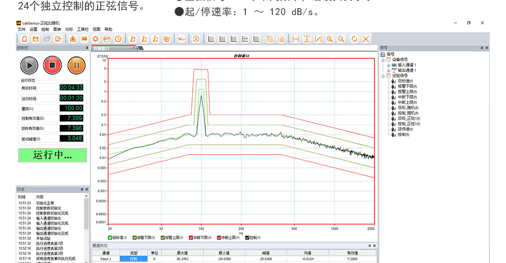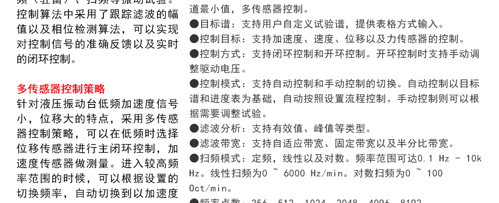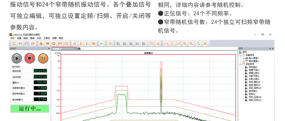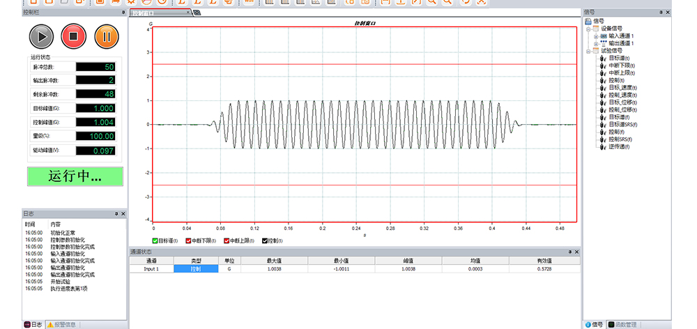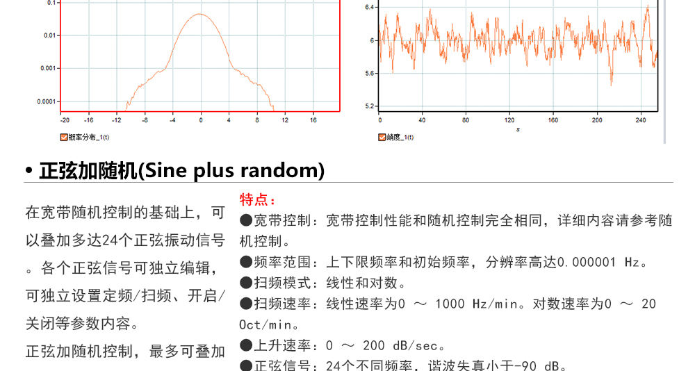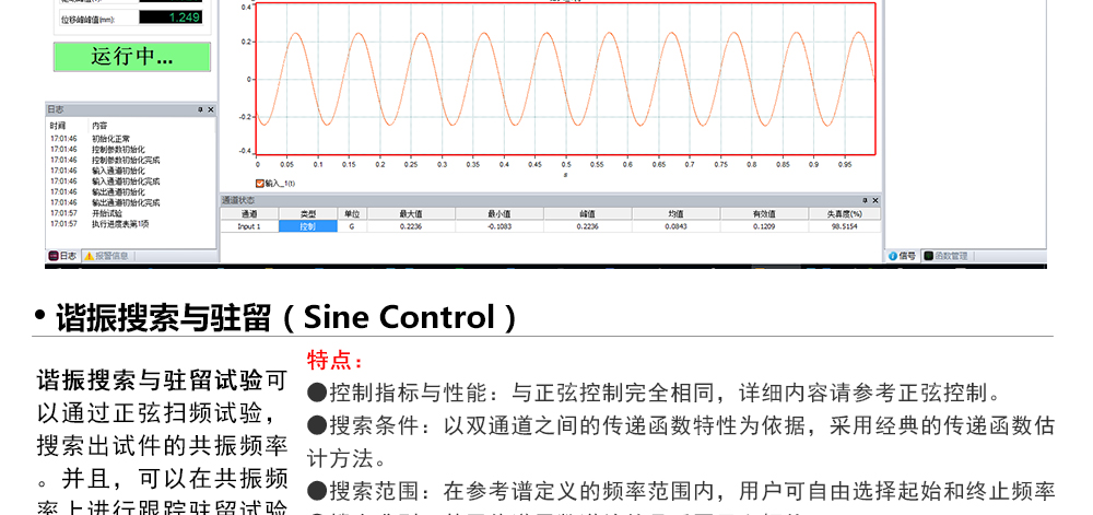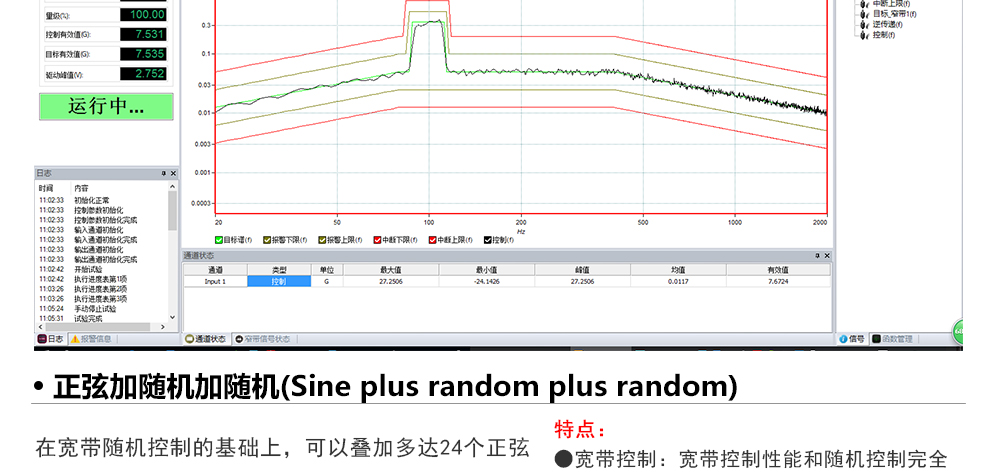 用途:正弦試驗可以控制振動臺實現(xiàn)定頻(駐留)、掃頻等振動試驗。控制算法中采用了跟蹤濾波的幅值以及相位檢測算法,可以實現(xiàn)對控制信號的準(zhǔn)確反饋以及實時的閉環(huán)控制。