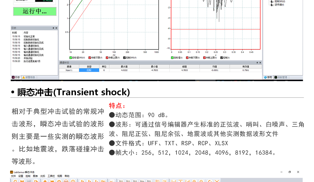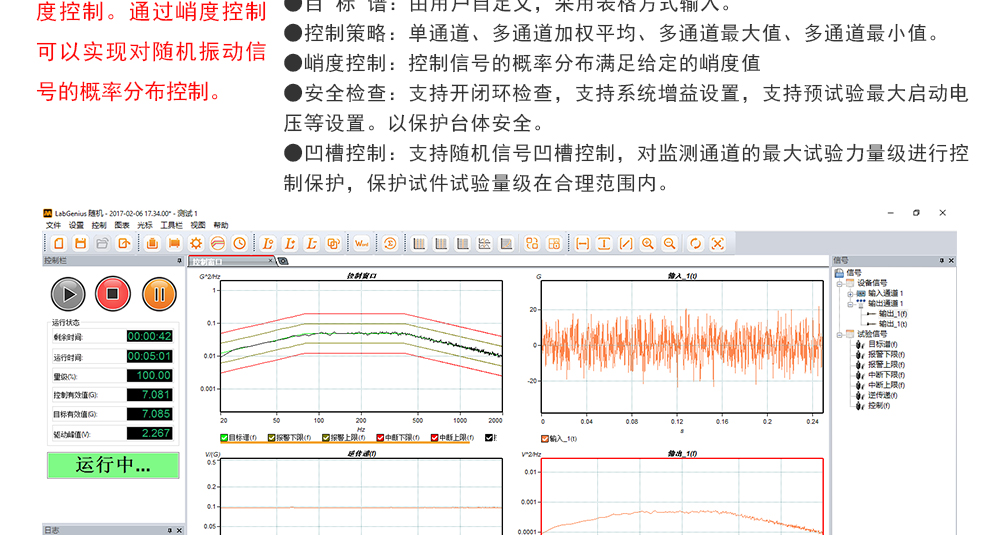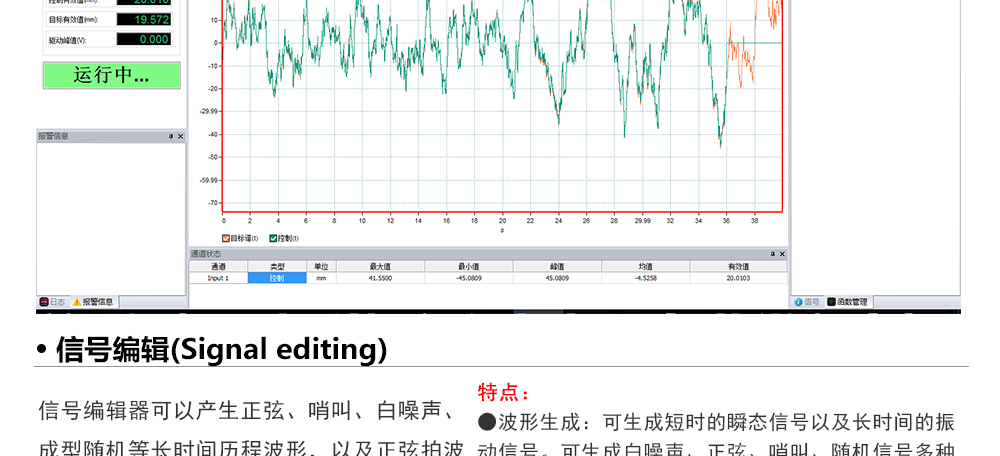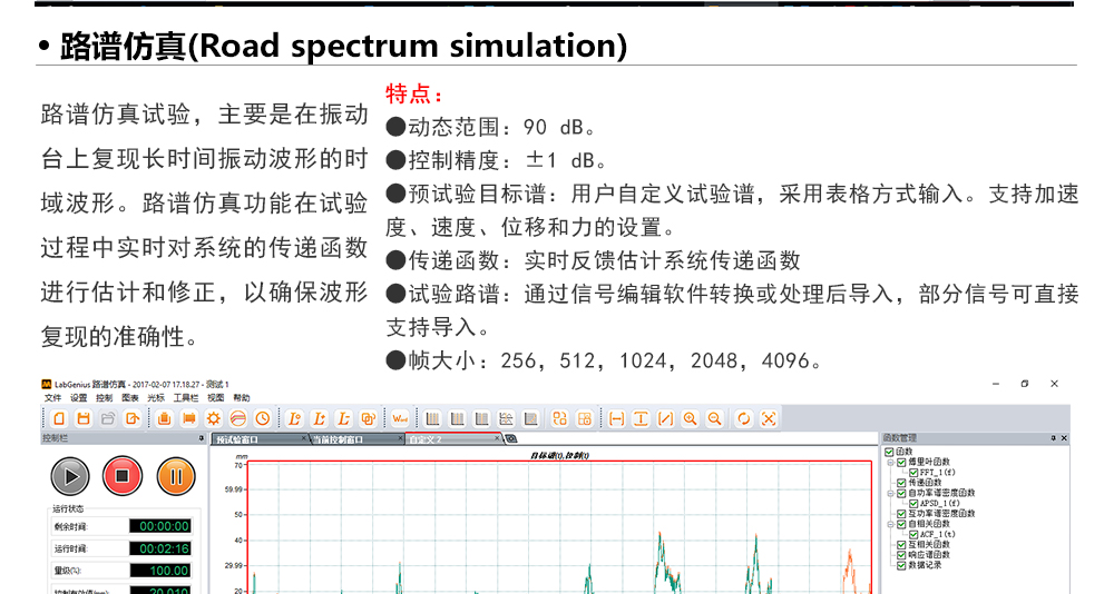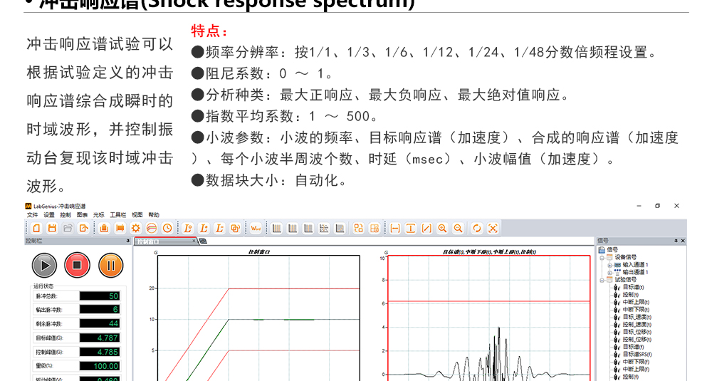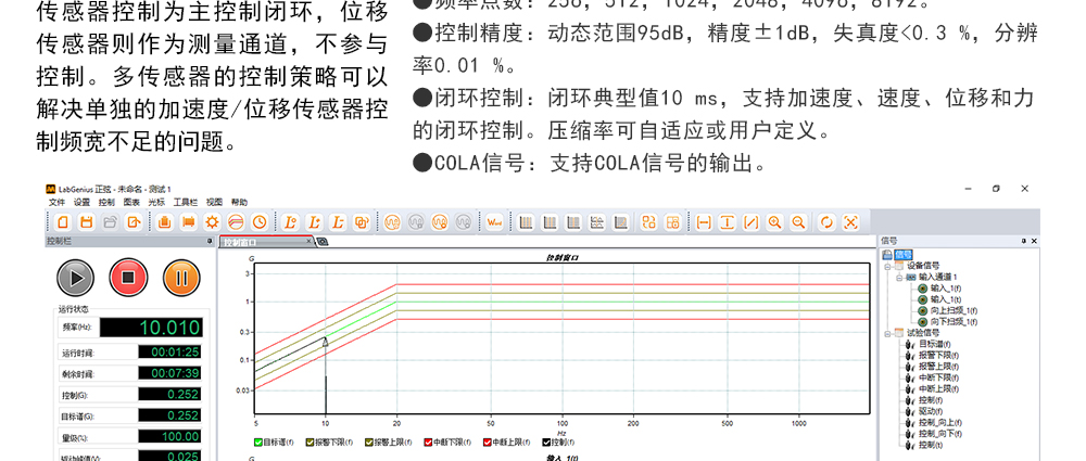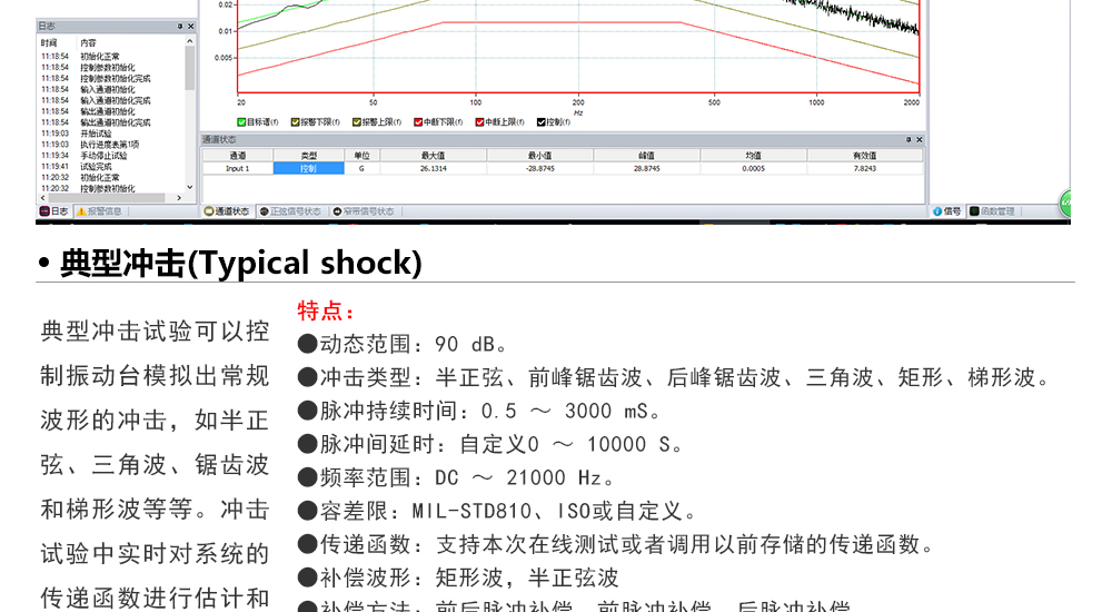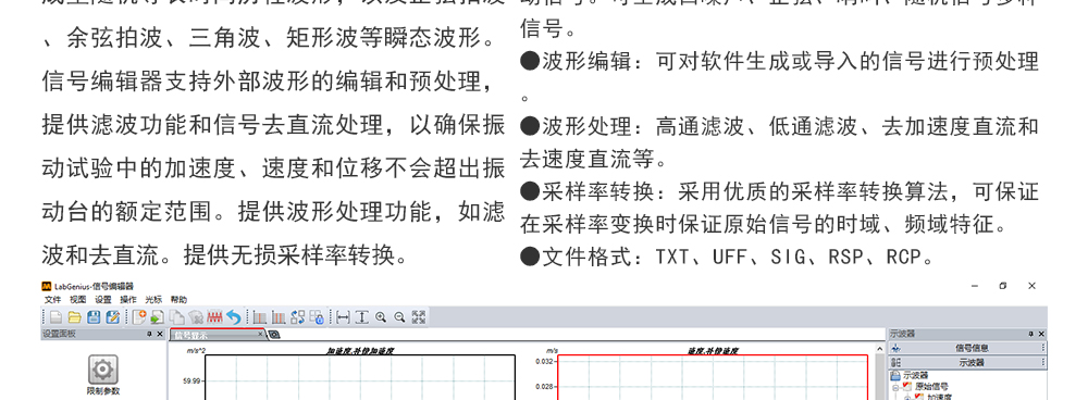 用途:正弦試驗可以控制振動臺實現(xiàn)定頻(駐留)、掃頻等振動試驗。控制算法中采用了跟蹤濾波的幅值以及相位檢測算法,可以實現(xiàn)對控制信號的準(zhǔn)確反饋以及實時的閉環(huán)控制。