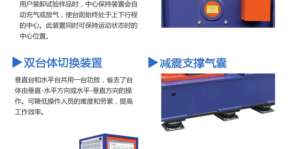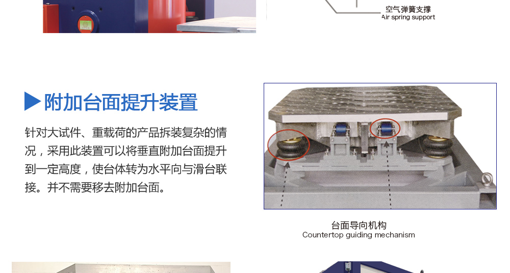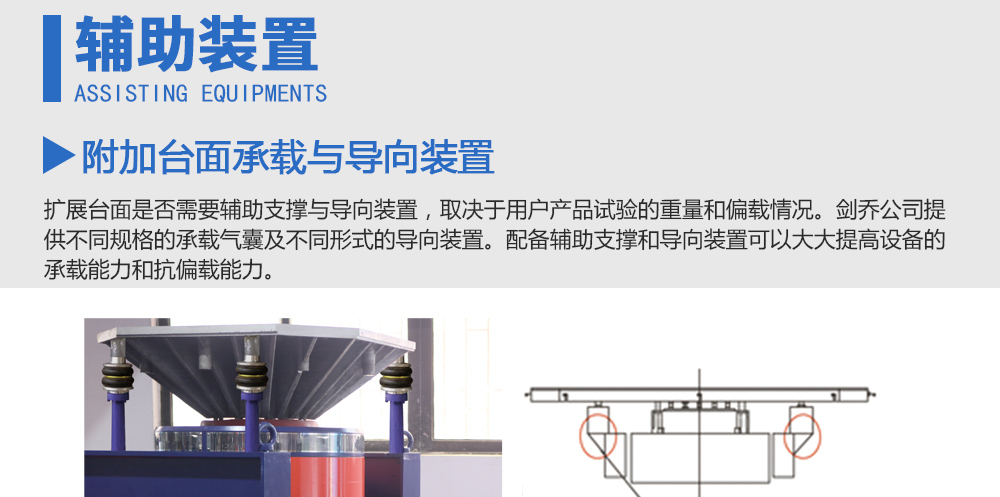 用途:擴(kuò)展臺(tái)面是否需要輔助支撐與導(dǎo)向裝置,取決于用戶產(chǎn)品試驗(yàn)的重量和偏載情況。劍喬公司提供不同規(guī)格的承載氣囊及不同形式的導(dǎo)向裝置。配備輔助支撐和導(dǎo)向裝置可以大大提高設(shè)備的承載能